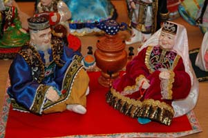 Мимо некоторых изделий нельзя пройти без улыбки. Забавные фигурки кукол - смешной толстячок в тюбетейке и жилетке нараспашку, важно восседающий на груде подушек с пиалой чая в пухлой руке, гармонист, развернувший свою трехрядку, сельская красавица с коромыслом через плечо - сразу же привлекают внимание. Отдельно представлены куклы - исторические персонажи во главе с царицей Сююмбике в расшитом блестками платье.